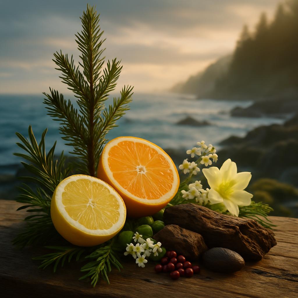 abeto, cardamomo, limón (lima ácida), naranja, petit grain y notas marinas