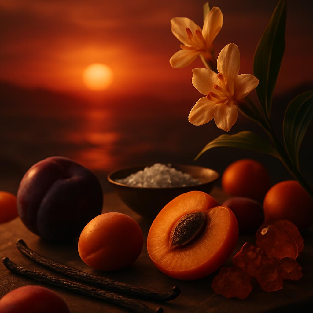 Notas de Salida: La fragancia se inicia con una combinación de ciruela, albaricoque y sal marina, proporcionando una apertura jugosa y ligeramente salada.