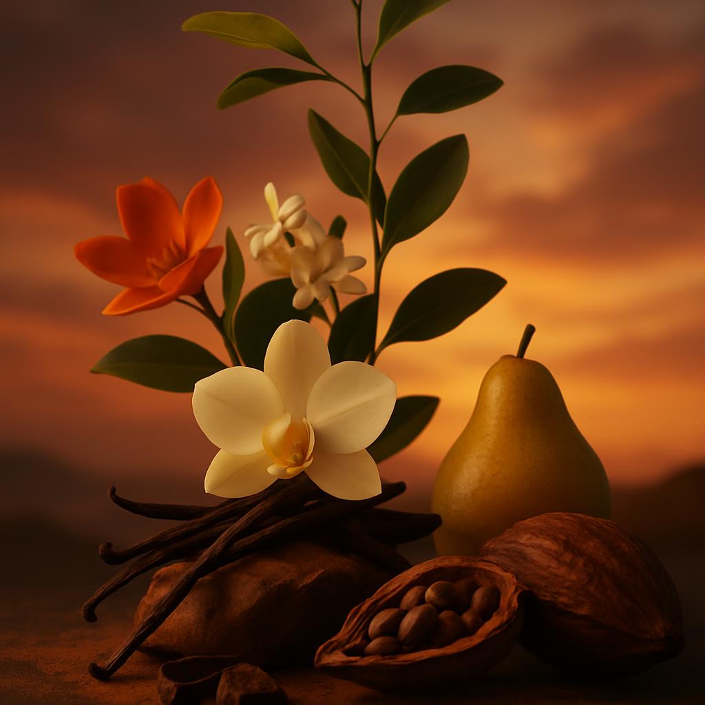 Notas de Fondo: Una base profunda y adictiva que combina la cremosidad de la vainilla de Madagascar y la vainilla de Tahití. Este dúo se enriquece con matices de cacao amargo y la suavidad almizclada del almizcle ambreta, dejando una estela persistente y sofisticada.