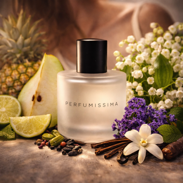 Notas de Salida: La fragancia abre con una frescura luminosa y frutal donde destaca la pera jugosa y la lima (limón verde), acompañadas por un toque cítrico de mandarina y la suavidad aterciopelada de la piña.