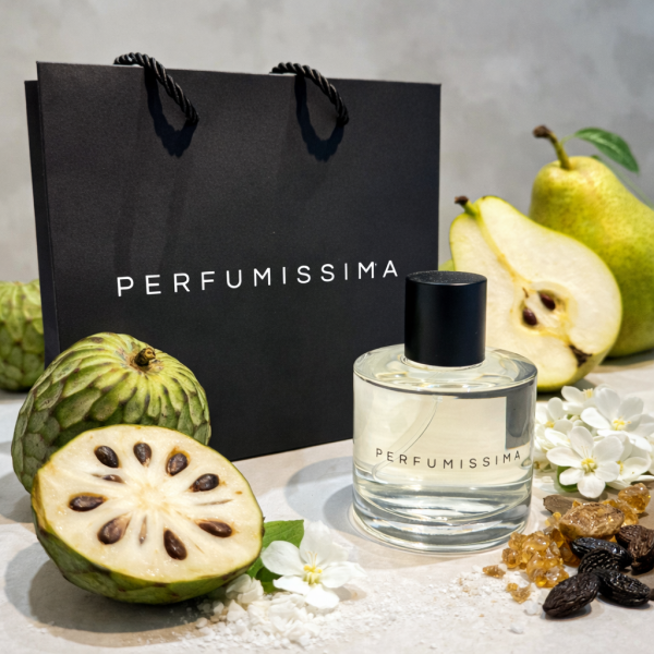 El centro de la fragancia revela su identidad tropical mediante una mezcla de chirimoya y pera jugosa. La chirimoya aporta un aroma dulce y cremoso —similar a una mezcla de plátano y piña—, mientras que la pera añade una textura acuática y crujiente.